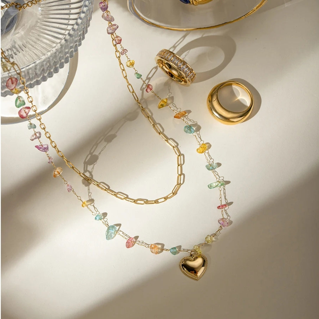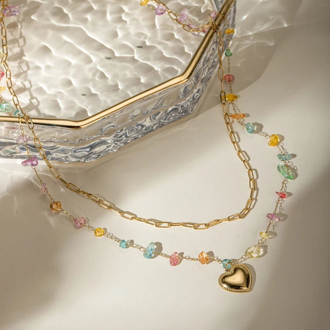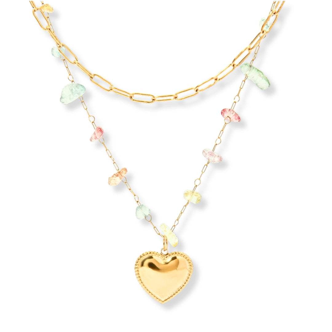 Die Halskette FENJA ist ein verspieltes Schmuckstück, das Leichtigkeit und Romantik vereint. Mit ihrer doppellagigen Gestaltung kombiniert sie eine feine 18K vergoldete Kette mit zarten, farbigen Kiesstein-Perlen und einer eleganten Herz-Anhänger-Kette. Diese harmonische Kombination verleiht dem Schmuck eine besondere Tiefe und ein modernes, feminines Flair.