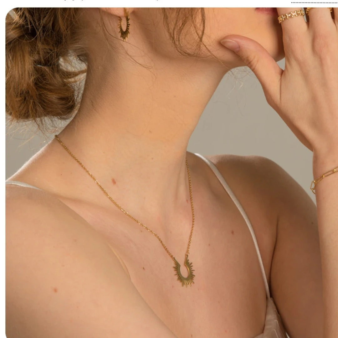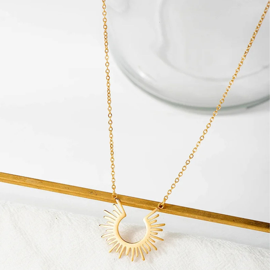 Die Halskette HELLE verkörpert die Kraft und Schönheit der Sonne in einem minimalistischen, aber ausdrucksstarken Design. Der fein gearbeitete Sonnenstrahlen-Anhänger symbolisiert Energie, Licht und Positivität – perfekt für alle, die ein Statement setzen möchten.